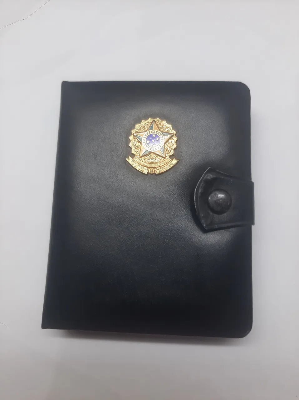 Estojo em couro com brasão da República, contendo duas moedas comemorativas do sesquicentenário da independência do Brasil sendo 1 moeda de 1 cruzeiro em níquel e 1 moeda de 20 cruzeiros em prata de lei