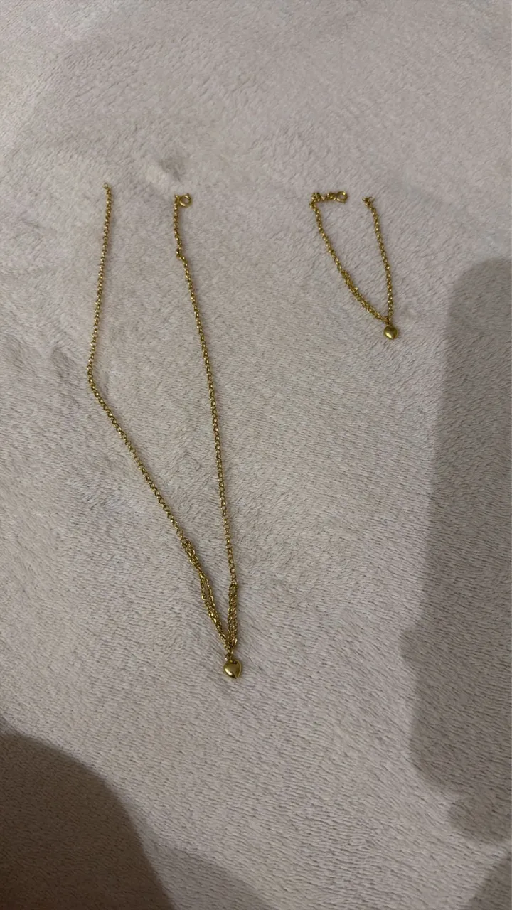 Conjunto elegante de colar e pulseira em ouro 18k, perfeito para adicionar um toque de sofisticação ao seu visual. Design delicado e charmoso, ideal para diversas ocasiões.