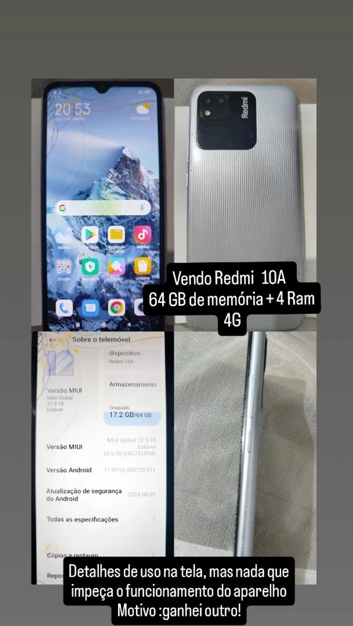 Smartphone Redmi 10A, com 64GB de memória e 4GB de RAM. Aparelho com detalhes de uso na tela, mas funcionando perfeitamente. Ótima opção!