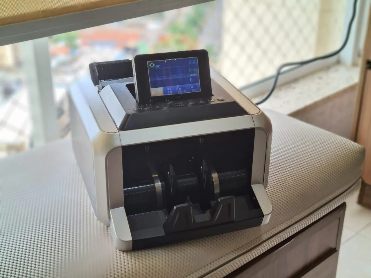 Contadora de cédulas profissional, ideal para comércios, escritórios, mercados, lotéricas e uso pessoal. Equipamento moderno, eficiente e fácil de usar, garantindo agilidade e segurança na contagem de dinheiro.