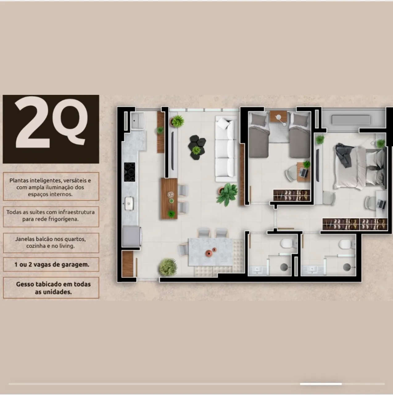 *Este maravilhoso apartamento conta com dois confortáveis quartos, sendo uma suite master, e mais um banheiro social, distribuídos em um ambiente amplo de 61.44m?. O piso em fino acabamento de porcelanato, transmite elegância e delicadeza, sem deixar de lado a facilidade de limpeza e durabilidade. E ainda conta com 2 vagas de garagem.