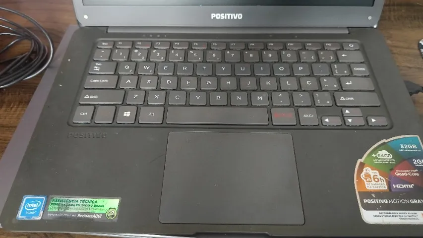 Notebook Positivo Motion Gray com defeito com processador Quad-Core, 32GB de armazenamento e tela de alta definição. Ideal para quem quer consertar para revender, com design moderno e bateria de 6 horas de duração.