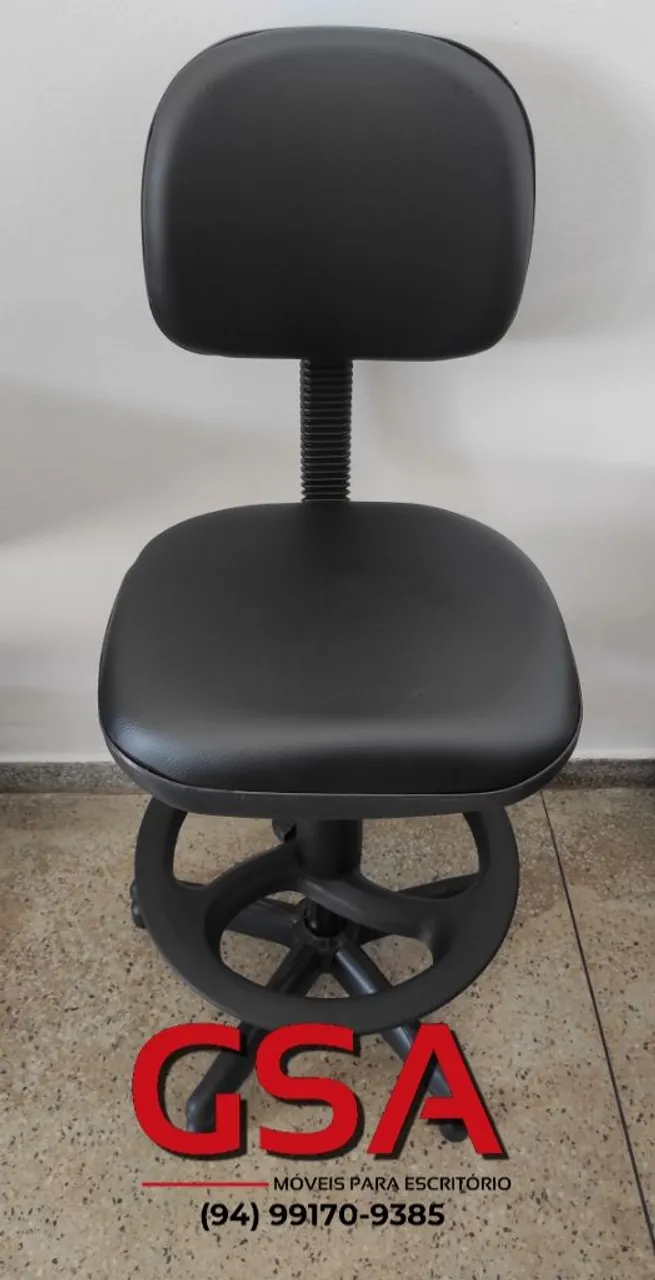 Cadeira Caixa com pistão à gás para regulagem de altura, espuma injetada para maior conforto e durabilidade e apoio para os pés com regulagem de altura . Revestida em couro ecológico na cor preto.