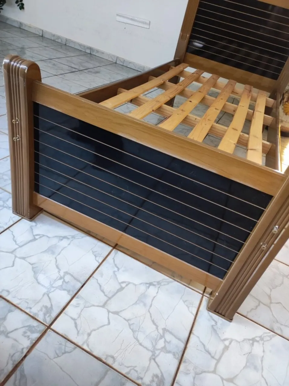 Linda cama de madeira com design elegante e detalhes em preto. Ideal para quem busca conforto e estilo para o quarto. Cama possui alguns detalhes nos locais onde se parafusa a base. Está bem conservada !!! Não entrego !