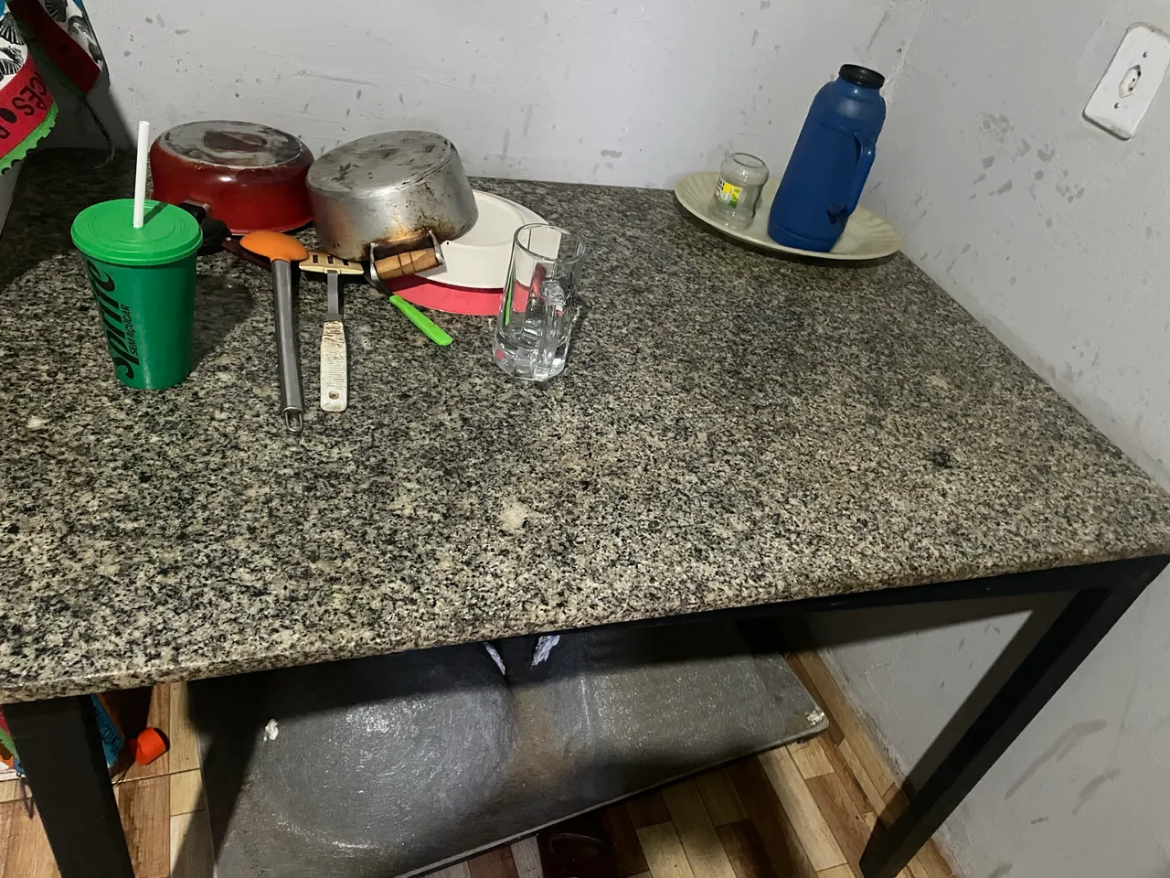 Linda mesa com tampo de granito e estrutura resistente. Perfeita para sua cozinha ou área de refeições!