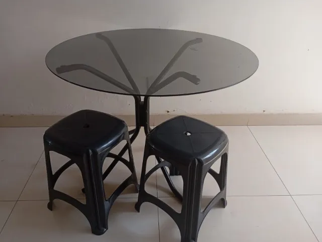 Mesa de vidro escuro com dois tamburetes de plástico em ótimo estado de uso.Somente pra retirar no local.