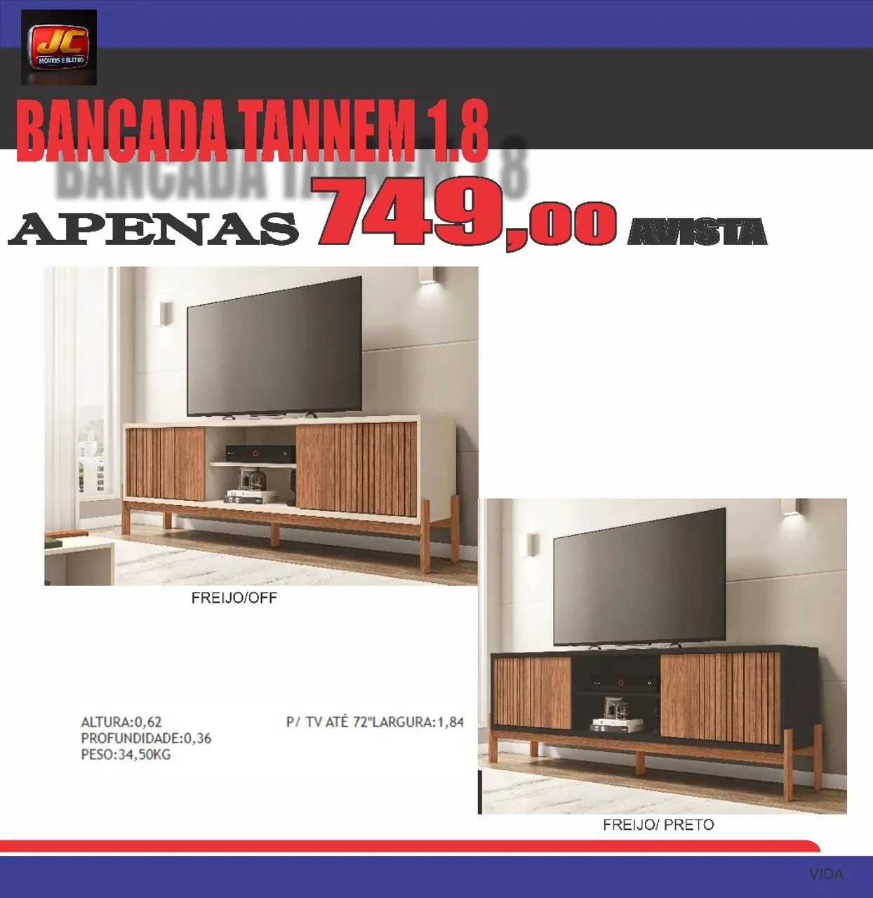 Apresentamos a bancada Tannen 1.8, um móvel que une design moderno e funcionalidade para a sua sala. Com detalhes em freijó e off ou preto, ela oferece espaço para sua TV de até 72 polegadas e ainda organiza seus aparelhos eletrônicos. Leve, com 34,50kg e 0,62m de altura, ela é perfeita para transformar seu ambiente!