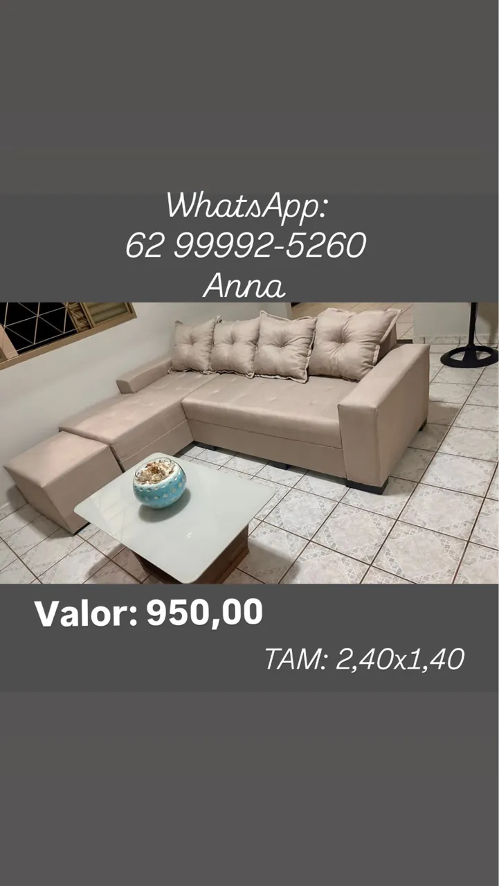 SOFÁS DE CANTO | PUFF DE BRINDE | VÁRIAS CORES | GOIÂNIA E REGIÕES CONSULTE!! CONTATO: 629992-5260 *ANA* *dados técnicos do sofá de canto* Tecido: Sued amassado Madeira : Eucalipto Espuma : D 33 Garantia: 6 meses CONTATO: 629992-5260 *ANA* FAZEMOS ENTREGA: GOIÂNIA E REGIÕES. ENTREGA GRÁTIS GOIÂNIA E APARECIDA DE GOIÂNIA . ACEITAMOS CARTÃO DE CRÉDITO PARCELAMOS EM 12x CONTATO: 629992-5260 *ANA*
