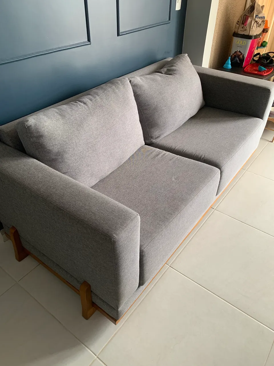 Sofá de linho cinza claro, com pés de madeira, de dois lugares fixo, super macio e confortável, feito na medida de 2.05m.