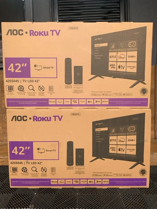 TV AOC Roku 42 polegadas com Smart TV, resolução Full HD e design moderno. Desfrute de uma experiência de entretenimento completa com acesso a diversos aplicativos e serviços de streaming.